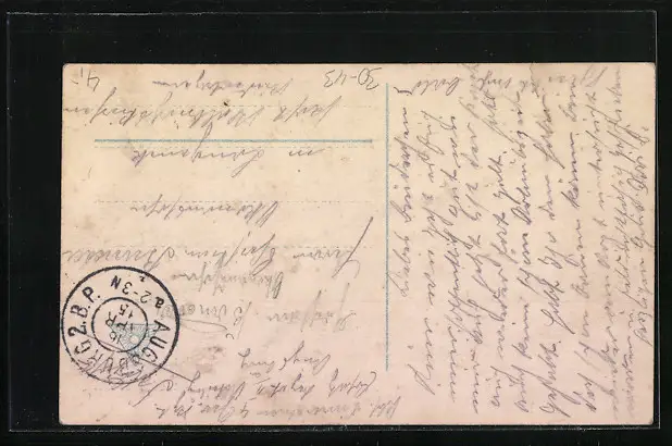 Personenbezogene Daten auf der Rückseite der Karte wurden durch blauen Textmarker unkenntlich gemacht. Die blauen Stellen sind auf die Vorderseite durchgeweicht und wirken sich negativ auf das Postkartenfoto aus