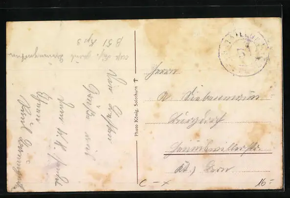 Personenbezogene Daten auf der Rückseite der Karte wurden durch blauen Textmarker unkenntlich gemacht. Die blauen Stellen sind auf die Vorderseite durchgeweicht und wirken sich negativ auf das Postkartenfoto aus