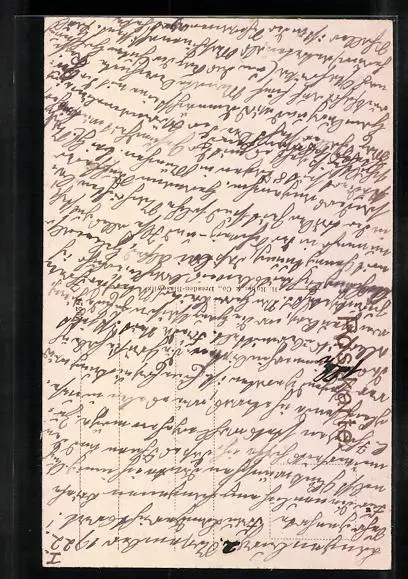 Personenbezogene Daten auf der Rückseite der Karte wurden durch blauen Textmarker unkenntlich gemacht. Die blauen Stellen sind auf die Vorderseite durchgeweicht und wirken sich negativ auf das Postkartenfoto aus