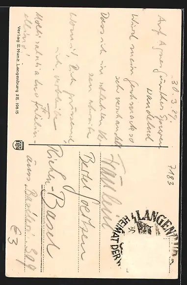 Personenbezogene Daten auf der Rückseite der Karte wurden durch blauen Textmarker unkenntlich gemacht. Die blauen Stellen sind auf die Vorderseite durchgeweicht und wirken sich negativ auf das Postkartenfoto aus