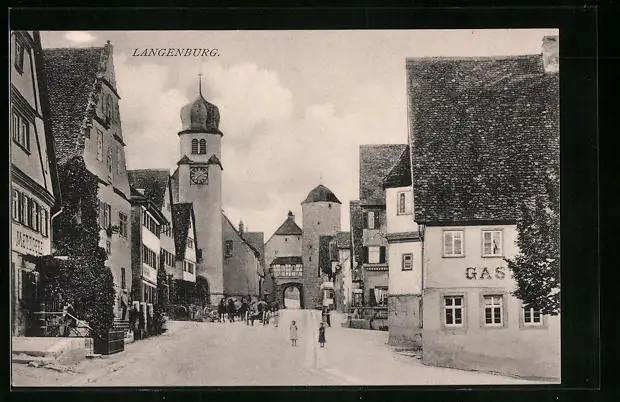 AK Langenburg, Strasse Innere Stadt mit Uhrenturm und Metzgerei