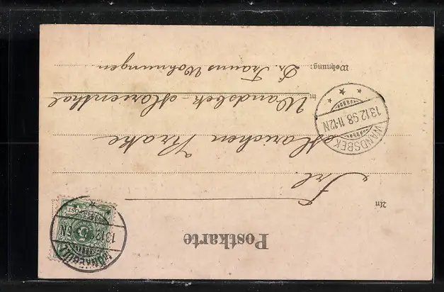 alte Ansichtskarte, gelaufen 1898, Eckknicke li. unten u. re. oben, Bugspuren li. oben u. unten, Stempelspur, guter Zustand