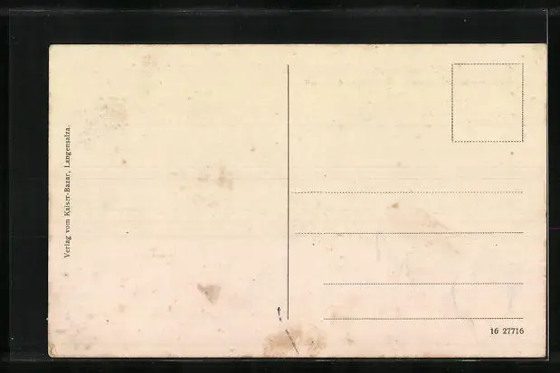 Personenbezogene Daten auf der Rückseite der Karte wurden durch blauen Textmarker unkenntlich gemacht. Die blauen Stellen sind auf die Vorderseite durchgeweicht und wirken sich negativ auf das Postkartenfoto aus