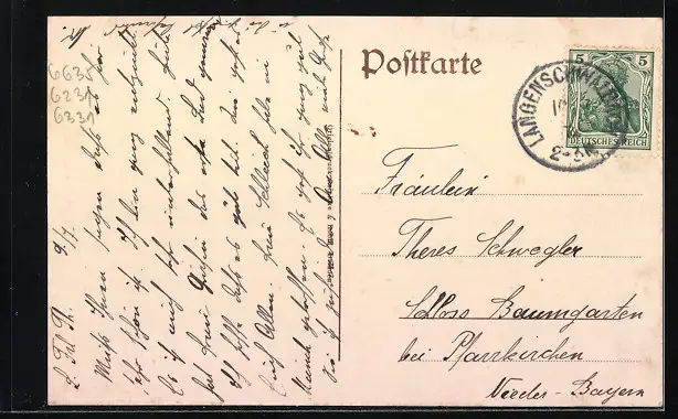 Personenbezogene Daten auf der Rückseite der Karte wurden durch blauen Textmarker unkenntlich gemacht. Die blauen Stellen sind auf die Vorderseite durchgeweicht und wirken sich negativ auf das Postkartenfoto aus