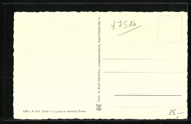 Personenbezogene Daten auf der Rückseite der Karte wurden durch blauen Textmarker unkenntlich gemacht. Die blauen Stellen sind auf die Vorderseite durchgeweicht und wirken sich negativ auf das Postkartenfoto aus