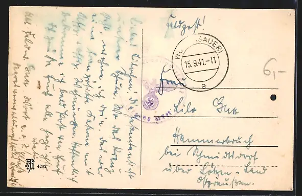 alte Ansichtskarte, gelaufen 1941, Stecknadelloch oben re. u. li., Einriss re. oben, guter Zustand