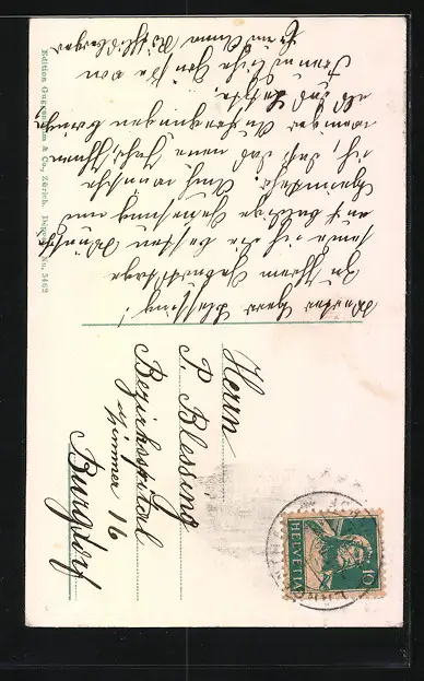 Personenbezogene Daten auf der Rückseite der Karte wurden durch blauen Textmarker unkenntlich gemacht. Die blauen Stellen sind auf die Vorderseite durchgeweicht und wirken sich negativ auf das Postkartenfoto aus