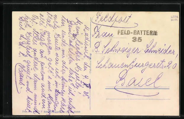 Personenbezogene Daten auf der Rückseite der Karte wurden durch blauen Textmarker unkenntlich gemacht. Die blauen Stellen sind auf die Vorderseite durchgeweicht und wirken sich negativ auf das Postkartenfoto aus