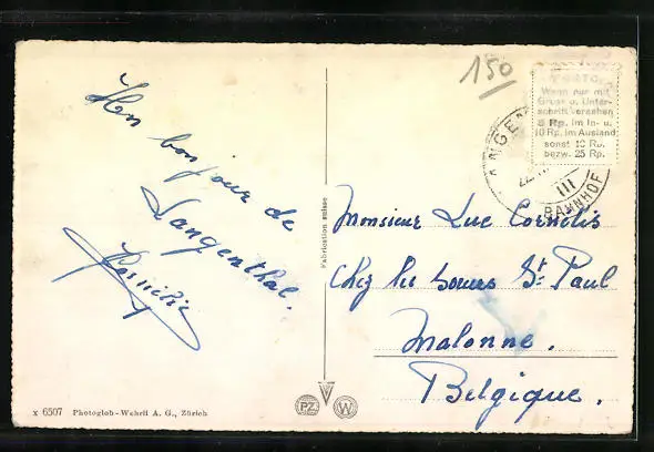 Personenbezogene Daten auf der Rückseite der Karte wurden durch blauen Textmarker unkenntlich gemacht. Die blauen Stellen sind auf die Vorderseite durchgeweicht und wirken sich negativ auf das Postkartenfoto aus