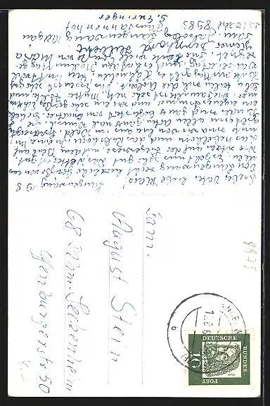 Personenbezogene Daten auf der Rückseite der Karte wurden durch blauen Textmarker unkenntlich gemacht. Die blauen Stellen sind auf die Vorderseite durchgeweicht und wirken sich negativ auf das Postkartenfoto aus