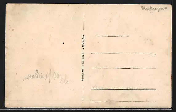 Personenbezogene Daten auf der Rückseite der Karte wurden durch blauen Textmarker unkenntlich gemacht. Die blauen Stellen sind auf die Vorderseite durchgeweicht und wirken sich negativ auf das Postkartenfoto aus
