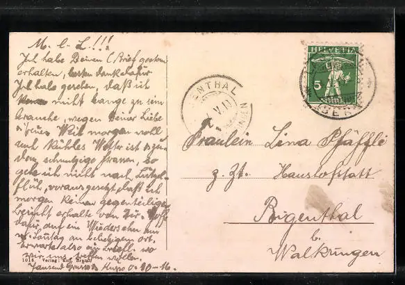 Personenbezogene Daten auf der Rückseite der Karte wurden durch blauen Textmarker unkenntlich gemacht. Die blauen Stellen sind auf die Vorderseite durchgeweicht und wirken sich negativ auf das Postkartenfoto aus