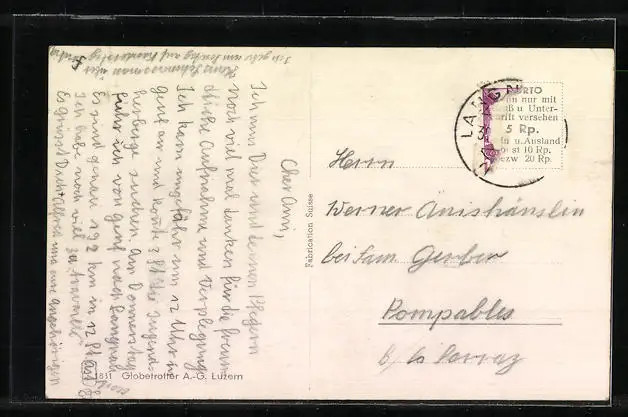 Personenbezogene Daten auf der Rückseite der Karte wurden durch blauen Textmarker unkenntlich gemacht. Die blauen Stellen sind auf die Vorderseite durchgeweicht und wirken sich negativ auf das Postkartenfoto aus