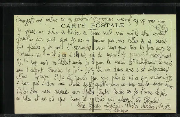 Personenbezogene Daten auf der Rückseite der Karte wurden durch blauen Textmarker unkenntlich gemacht. Die blauen Stellen sind auf die Vorderseite durchgeweicht und wirken sich negativ auf das Postkartenfoto aus