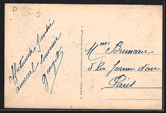 Personenbezogene Daten auf der Rückseite der Karte wurden durch blauen Textmarker unkenntlich gemacht. Die blauen Stellen sind auf die Vorderseite durchgeweicht und wirken sich negativ auf das Postkartenfoto aus