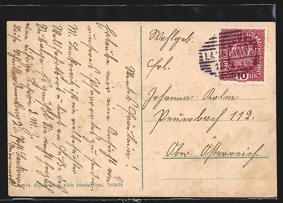 Personenbezogene Daten auf der Rückseite der Karte wurden durch blauen Textmarker unkenntlich gemacht. Die blauen Stellen sind auf die Vorderseite durchgeweicht und wirken sich negativ auf das Postkartenfoto aus