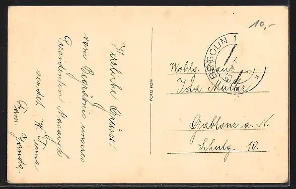 Personenbezogene Daten auf der Rückseite der Karte wurden durch blauen Textmarker unkenntlich gemacht. Die blauen Stellen sind auf die Vorderseite durchgeweicht und wirken sich negativ auf das Postkartenfoto aus