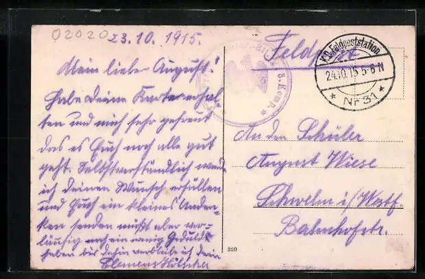 alte Ansichtskarte, gelaufen 1915 als Feldpost, Eckknick re. oben, guter Zustand