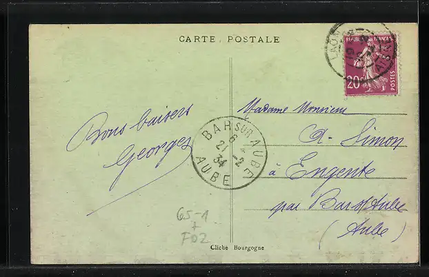 Personenbezogene Daten auf der Rückseite der Karte wurden durch blauen Textmarker unkenntlich gemacht. Die blauen Stellen sind auf die Vorderseite durchgeweicht und wirken sich negativ auf das Postkartenfoto aus