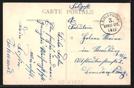 Personenbezogene Daten auf der Rückseite der Karte wurden durch blauen Textmarker unkenntlich gemacht. Die blauen Stellen sind auf die Vorderseite durchgeweicht und wirken sich negativ auf das Postkartenfoto aus