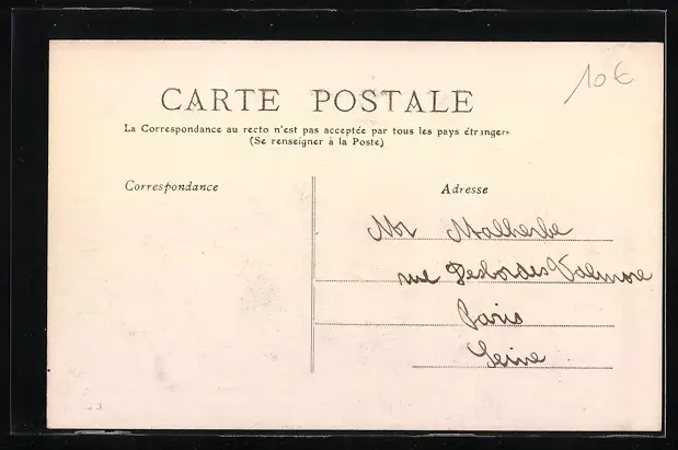 Personenbezogene Daten auf der Rückseite der Karte wurden durch blauen Textmarker unkenntlich gemacht. Die blauen Stellen sind auf die Vorderseite durchgeweicht und wirken sich negativ auf das Postkartenfoto aus