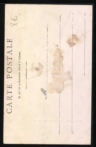 Personenbezogene Daten auf der Rückseite der Karte wurden durch blauen Textmarker unkenntlich gemacht. Die blauen Stellen sind auf die Vorderseite durchgeweicht und wirken sich negativ auf das Postkartenfoto aus