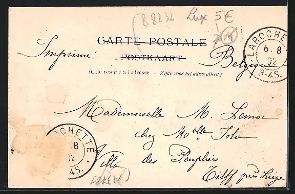 Personenbezogene Daten auf der Rückseite der Karte wurden durch blauen Textmarker unkenntlich gemacht. Die blauen Stellen sind auf die Vorderseite durchgeweicht und wirken sich negativ auf das Postkartenfoto aus