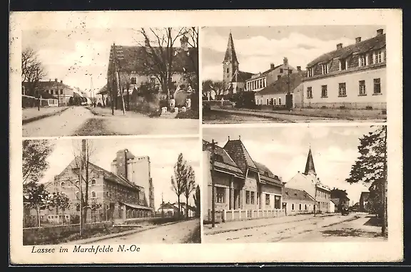 AK Lassee im Marschfelde, Fabrik, Strassenpartien an der Kirche