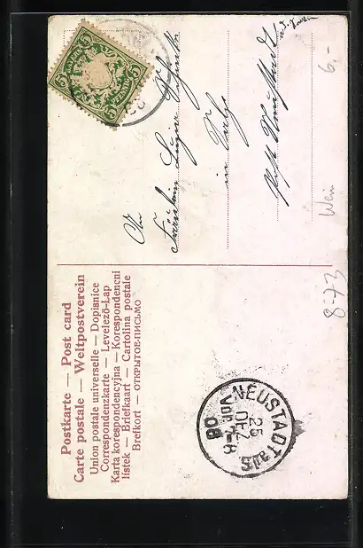 Personenbezogene Daten auf der Rückseite der Karte wurden durch blauen Textmarker unkenntlich gemacht. Die blauen Stellen sind auf die Vorderseite durchgeweicht und wirken sich negativ auf das Postkartenfoto aus