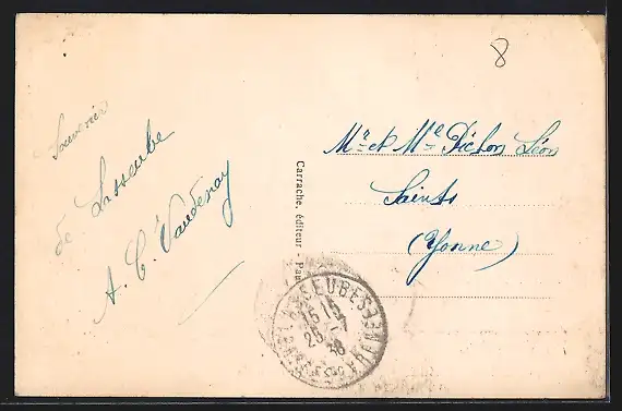 Personenbezogene Daten auf der Rückseite der Karte wurden durch blauen Textmarker unkenntlich gemacht. Die blauen Stellen sind auf die Vorderseite durchgeweicht und wirken sich negativ auf das Postkartenfoto aus