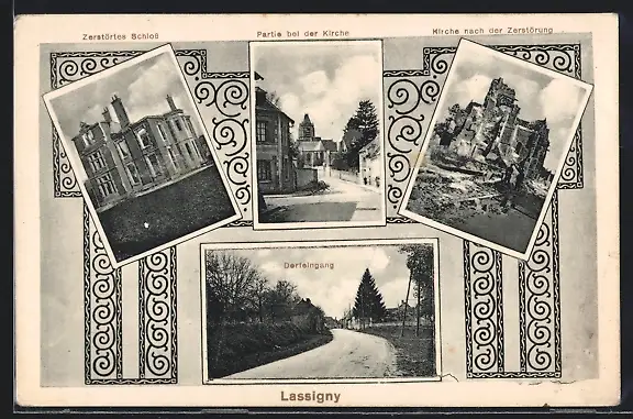 AK Lassigny, Zerstörtes Schloss, Partie bei der Kirche, Dorfeingang