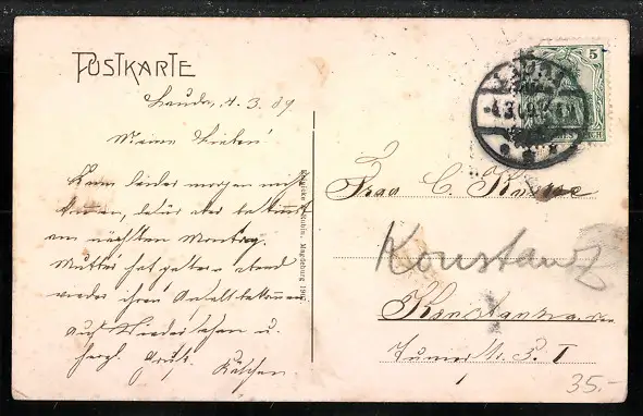Personenbezogene Daten auf der Rückseite der Karte wurden durch blauen Textmarker unkenntlich gemacht. Die blauen Stellen sind auf die Vorderseite durchgeweicht und wirken sich negativ auf das Postkartenfoto aus