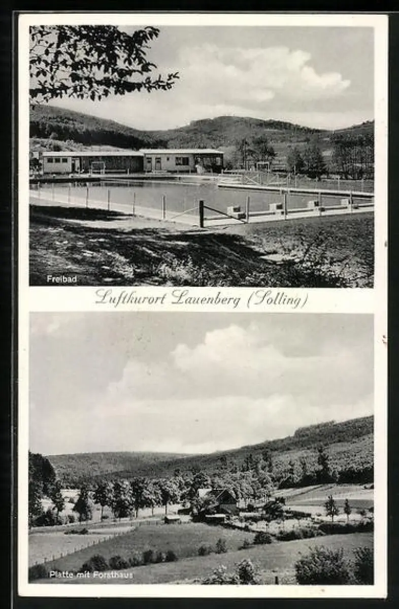 AK Lauenberg /Solling, Platte mit Gasthaus Forsthaus, Freibad