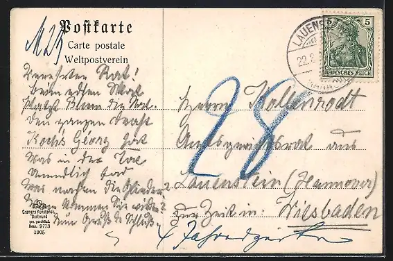 Personenbezogene Daten auf der Rückseite der Karte wurden durch blauen Textmarker unkenntlich gemacht. Die blauen Stellen sind auf die Vorderseite durchgeweicht und wirken sich negativ auf das Postkartenfoto aus