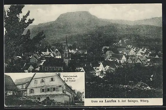 AK Laufen / Eyach, Gasthaus zum Adler, Teilansicht mit Kirche