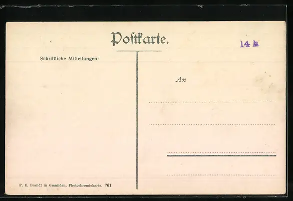 Personenbezogene Daten auf der Rückseite der Karte wurden durch blauen Textmarker unkenntlich gemacht. Die blauen Stellen sind auf die Vorderseite durchgeweicht und wirken sich negativ auf das Postkartenfoto aus