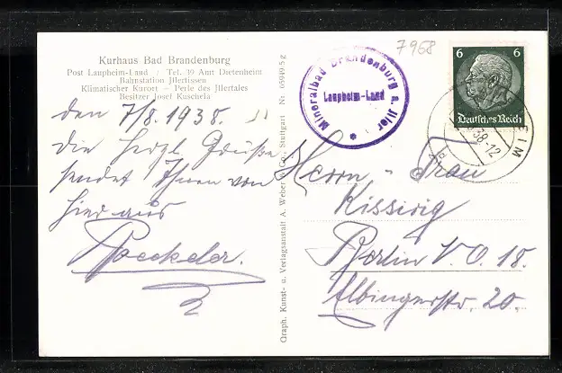 Personenbezogene Daten auf der Rückseite der Karte wurden durch blauen Textmarker unkenntlich gemacht. Die blauen Stellen sind auf die Vorderseite durchgeweicht und wirken sich negativ auf das Postkartenfoto aus
