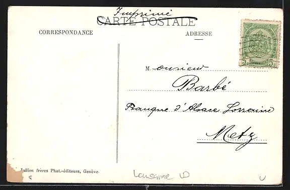 Personenbezogene Daten auf der Rückseite der Karte wurden durch blauen Textmarker unkenntlich gemacht. Die blauen Stellen sind auf die Vorderseite durchgeweicht und wirken sich negativ auf das Postkartenfoto aus