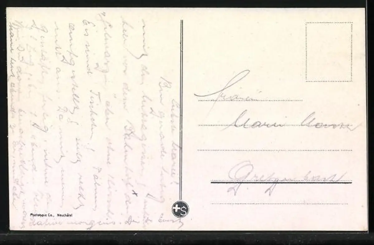 Personenbezogene Daten auf der Rückseite der Karte wurden durch blauen Textmarker unkenntlich gemacht. Die blauen Stellen sind auf die Vorderseite durchgeweicht und wirken sich negativ auf das Postkartenfoto aus