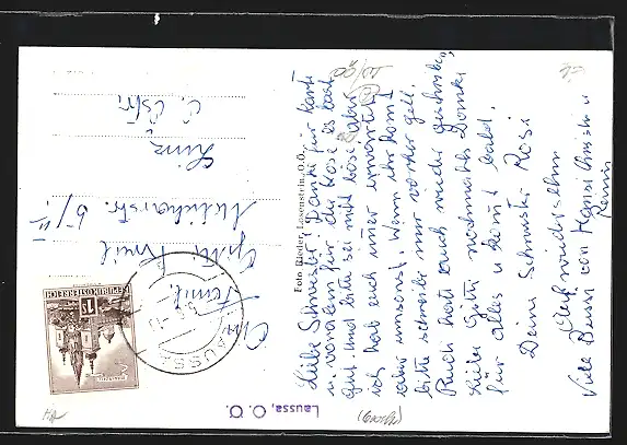 Personenbezogene Daten auf der Rückseite der Karte wurden durch blauen Textmarker unkenntlich gemacht. Die blauen Stellen sind auf die Vorderseite durchgeweicht und wirken sich negativ auf das Postkartenfoto aus