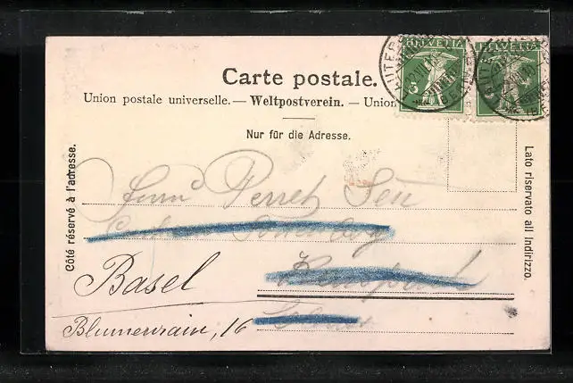 Personenbezogene Daten auf der Rückseite der Karte wurden durch blauen Textmarker unkenntlich gemacht. Die blauen Stellen sind auf die Vorderseite durchgeweicht und wirken sich negativ auf das Postkartenfoto aus