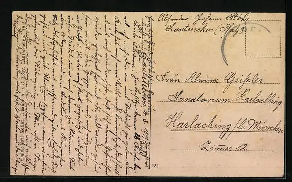 Personenbezogene Daten auf der Rückseite der Karte wurden durch blauen Textmarker unkenntlich gemacht. Die blauen Stellen sind auf die Vorderseite durchgeweicht und wirken sich negativ auf das Postkartenfoto aus