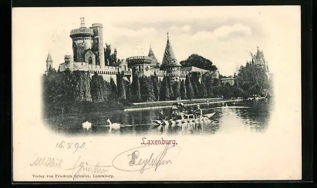 AK Laxenburg, Panorama am Wasser mit Bootspartie