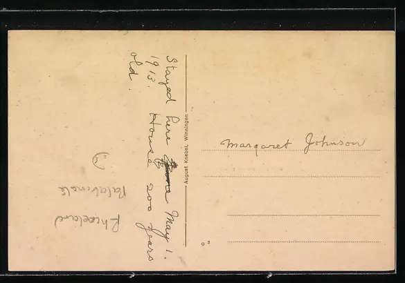 Personenbezogene Daten auf der Rückseite der Karte wurden durch blauen Textmarker unkenntlich gemacht. Die blauen Stellen sind auf die Vorderseite durchgeweicht und wirken sich negativ auf das Postkartenfoto aus