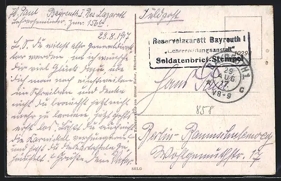 AK Lazarettstempel Reservelazarett Bayreuth I, Lehrerbildungsanstalt