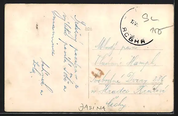 Personenbezogene Daten auf der Rückseite der Karte wurden durch blauen Textmarker unkenntlich gemacht. Die blauen Stellen sind auf die Vorderseite durchgeweicht und wirken sich negativ auf das Postkartenfoto aus