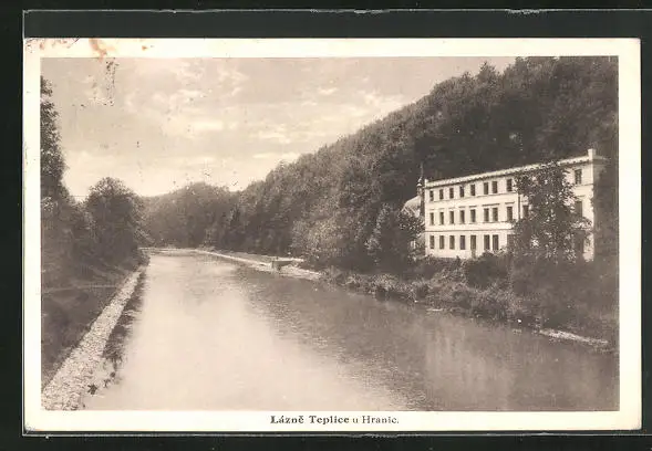 AK Lazne Teplice u Hranic, Uferpartie mit Gebäudeansicht