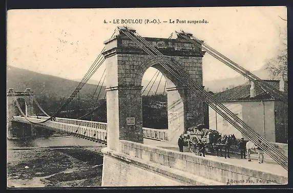AK Le Boulou, Le Pont suspendu avec charrette tirée par des chevaux