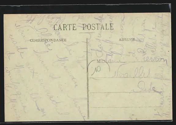 Personenbezogene Daten auf der Rückseite der Karte wurden durch blauen Textmarker unkenntlich gemacht. Die blauen Stellen sind auf die Vorderseite durchgeweicht und wirken sich negativ auf das Postkartenfoto aus