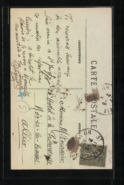 Personenbezogene Daten auf der Rückseite der Karte wurden durch blauen Textmarker unkenntlich gemacht. Die blauen Stellen sind auf die Vorderseite durchgeweicht und wirken sich negativ auf das Postkartenfoto aus